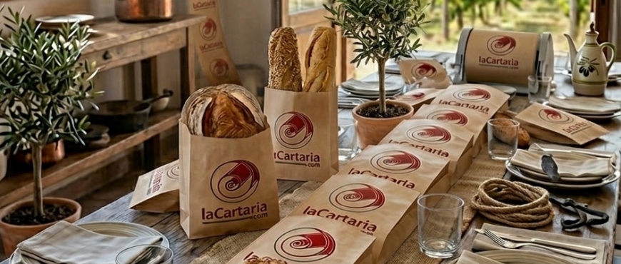 Buste pane bianche o avana con stampa personalizzata.