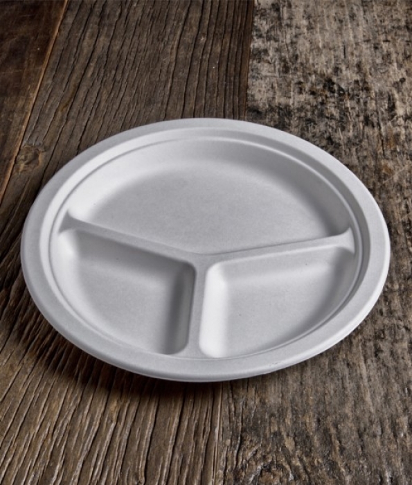 - Resistente all’acqua, il piatto triscomparto in polpa di cellulosa può contenere cibi liquidi caldi e freddi.