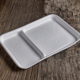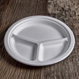 - Resistente all’acqua, il piatto triscomparto in polpa di cellulosa può contenere cibi liquidi caldi e freddi.
