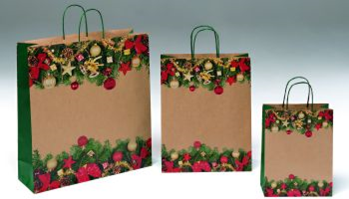 Borsetta Natale " Decorations" su kraft Bianco con Manico ritorto rosso